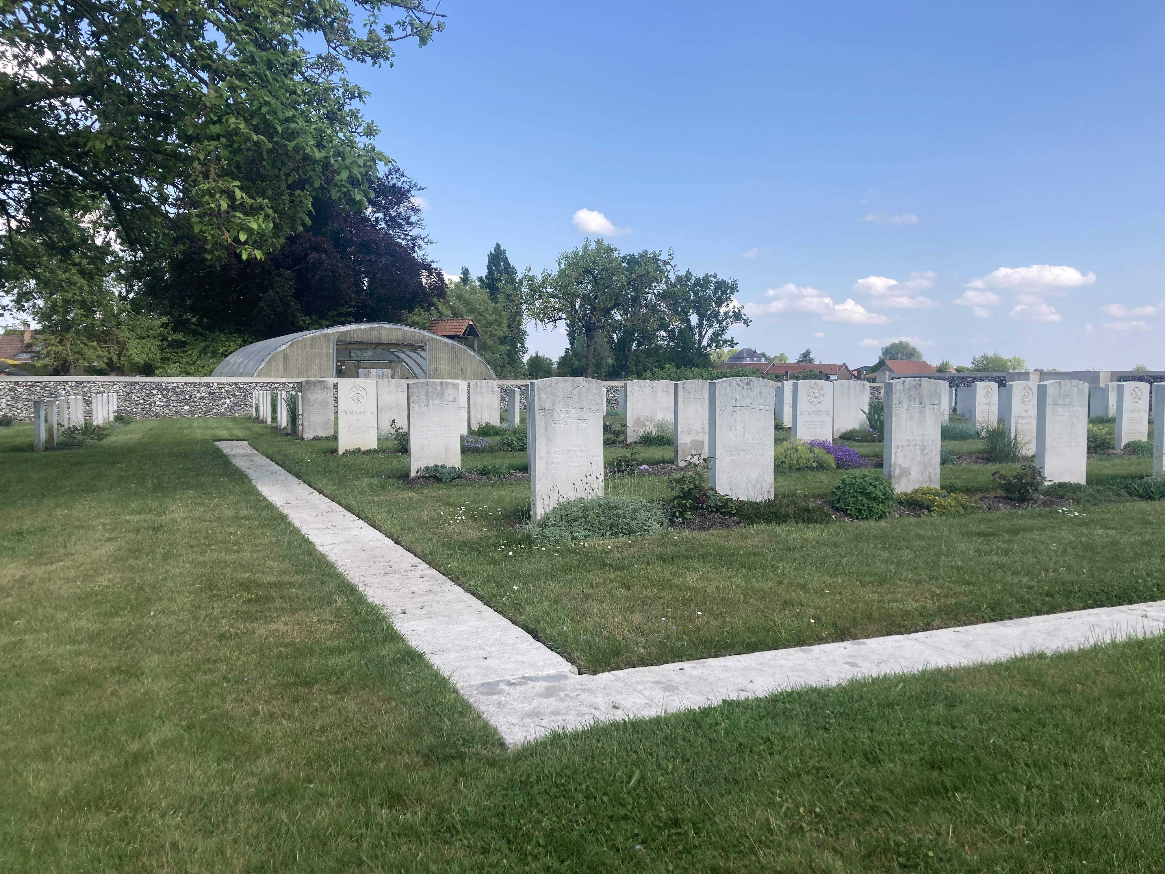 During the course of the conflict, Richebourg-L’Avoué experienced a series of sanguine waves. In May 1915, during the Battle of Festubert, British soldiers created a cemetery in an old orchard near a forward dressing station. Fourteen months later, the 11, 12, 13 battalions of the Royal Sussex Regiment, advanced against a German position known as the Boar’s Head Salient. It was a disaster that brought the agony of grief to villages across the South Downs of Sussex. In April 1918, Richebourg-L’Avoué was overrun by the Germans and soldiers in field grey buried some of their dead in the British cemetery. Then, in September the same year British forces returned, and the cemetery gained a new plot containing the graves of eighteen British soldiers killed in the vicinity.
